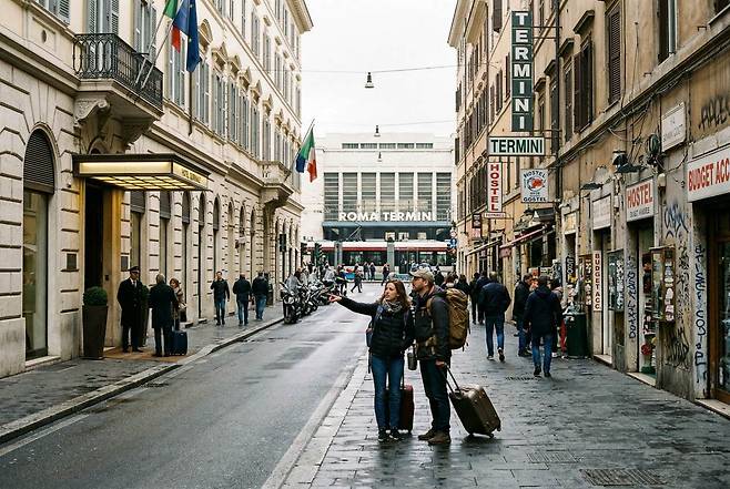 테르미니역 북서쪽에 밀집한 3~4성급 호텔들은 보안과 서비스 면에서 가장 안정적입니다. 24시간 프런트 데스크가 있는지 확인하고, 수하물 보관 서비스와 에어컨 여부 등도 확인하세요..