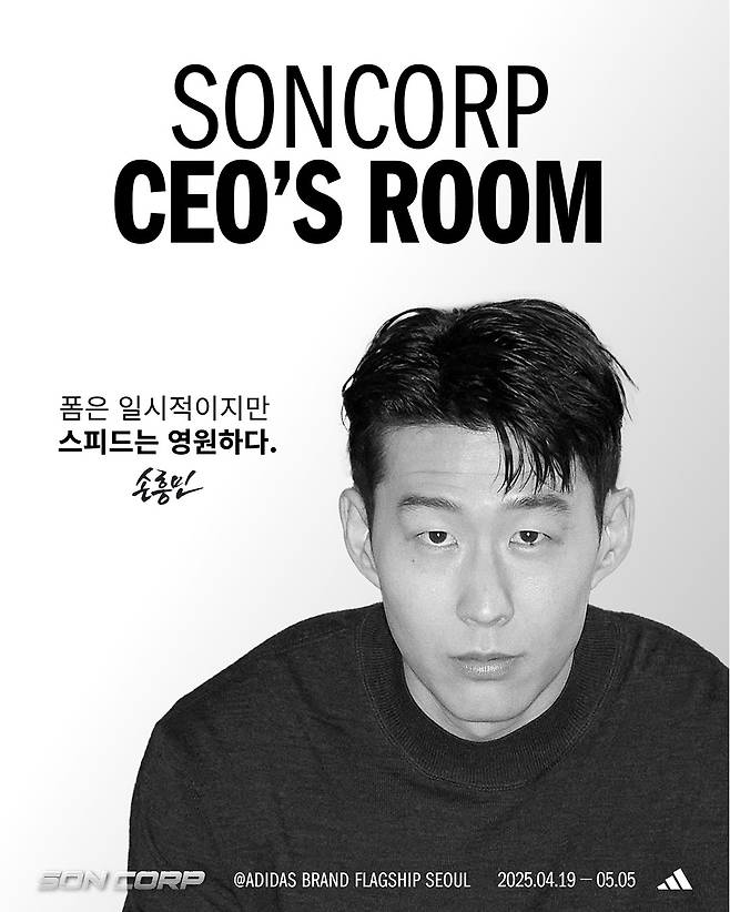 이번 ‘태극7’ 론칭을 기념해 4월 19일부터 5월 5일까지, 명동 아디다스 플래그십 서울에서는 ‘SON CORP’ 콘셉트로 ‘SON CORP CEO’S ROOM’ 팝업 이벤트가 진행된다. 손흥민의 커리어를 한눈에 볼 수 있는 특별 전시 공간과 손흥민의 소장품을 만나볼 수 있다. 월드컵 데뷔전과 EPL 골든부츠 수상, EFL 코너킥 골 당시 착용했던 10족 등 손흥민의 역사적인 순간들을 생생하게 만날 수 있는 것.