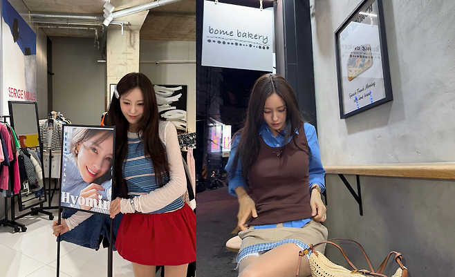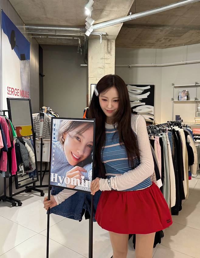 세 번째 사진에서 효민은 블루 스트라이프 탱크톱에 화이트 가디건, 레드 미니스커트를 조합하며 대담한 컬러 블록 스타일링을 시도하고 있다. 각기 다른 색상의 조화로 활기찬 봄 패션을 완성하며 젊은 감각을 드러내고 있다.