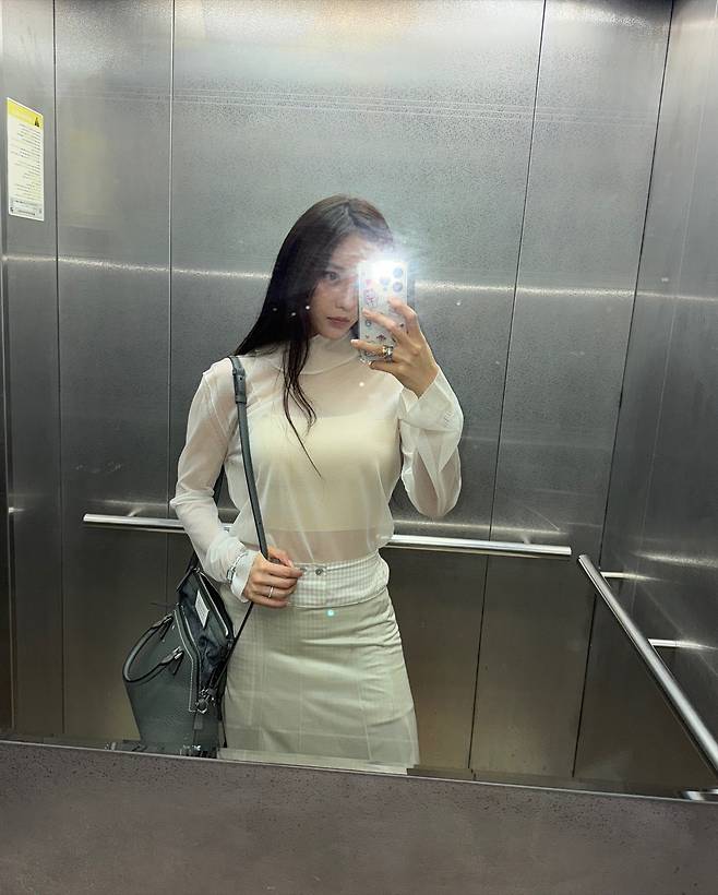 마지막 사진에서는 화이트 시스루 톱에 베이지 체크 스커트를 매치하며 우아한 모노톤 룩을 연출하고 있다. 블랙 핸드백으로 포인트를 주어 세련되고 여성스러운 매력을 강조하고 있다.