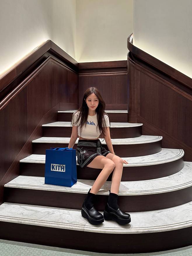 효민은 첫 번째 사진에서 크림색 키스 로고 티셔츠에 체크 패턴 미니스커트를 매치하며 세련된 캐주얼 룩을 연출하고 있다. 특히 검은색 플랫폼 부츠와 키스 쇼핑백으로 포인트를 주어 고급스러운 스트리트 패션을 완성했다.