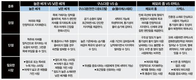 옆으로 누워 자는 스타일, 반듯이 누워 자는 스타일, 뒤척임이 많은 스타일 3가지로 나눠 베개를 추천한다.