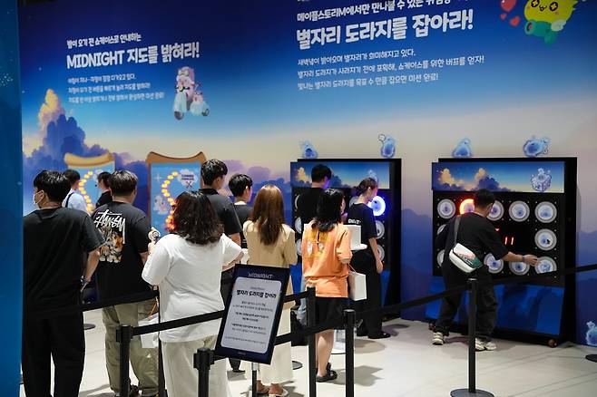 지난 23일 300명의 이용자를 초청해 광명 아이벡스 스튜디오에서 개최된 ‘미드나잇’ 행사는 현장 이벤트와 업데이트 발표 쇼케이스로 구성됐다. 1부는 ‘메이플스토리M’ 테마의 ‘메M네컷’ 사진촬영 부스, 커스터마이징 키링 제작 부스, 키아트 월 배경의 포토존 등 다양한 체험형 이벤트로 시작됐다.