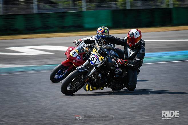 최고속도가 다른 기종에 비해 조금 부족하긴 한데 그건 배기량에 따른 높은 토크로 커버했고, 정비에 대한 건 하나도 신경 쓰지 않았다. 냉각이나 기어비 같은 트러블에 대해서 신경 쓸 일이 단 하나도 없었다. 그나마 제일 걱정했던 게 열 관리 쪽인데, 별도의 대용량 쿨러 역시 시중에 없어 순정 상태 그대로였고, 튜닝한 거라고는 머플러, 백스텝, 핸들 3가지 정도였다. 시간상 더 할 수 있는 것도 없어서 그것도 겨우 맞춰 나간 것이다. 경기 전날 연습주행 때 타보니 열 관리라던지, 레이스 중 발생할 수 있는 엔진이나 다른 트러블에 대한 걱정은 내려놨다. 딱 하나 걱정했던 건 뒷타이어가 160 사이즈인데 레이스 사양 타이어 중엔 맞는 사이즈가 없다. 그래서 피렐리 로쏘 4를 장착했는데, 로드 타이어를 끼고 서킷을 달려야 하는 부분에 대한 걱정이 좀 있었고, 나머지는 괜찮았다.