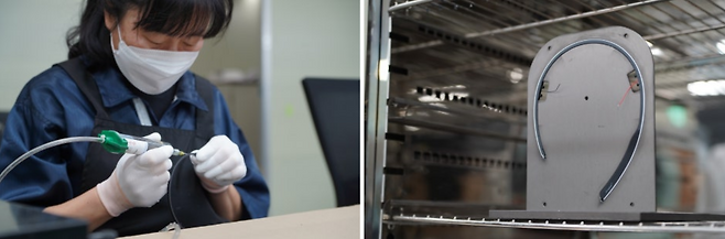 이날은 슬리피솔 플러스 생산이 한창이었다. 대부분의 과정이 수작업으로 이뤄진다. 먼저 머리띠의 틀이 되는 플라스틱에 전기 배선 역할을 하는 와이어를 끼운다. 여기에 덮개 역할을 하는 검은 플라스틱을 결합한다. 둘 사이에 주삿바늘처럼 생긴 도구를 이용해 저온 경화 본드인 에폭시 본드를 주입한다. 정 팀장은 “실온에서는 굳지 않기 때문에 결합 작업 중에 본드가 새어 나와도 깔끔하게 닦아낼 수 있다”고 설명했다.