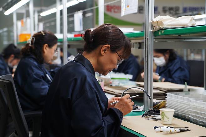 인천광역시 계양구에 위치한 한 공장을 찾았다. ‘공장’이라는 단어와 어울리지 않는 고요한 정적이 흐르는 곳이었다. 7~8명의 작업자가 한곳에 모여 앉아 머리띠처럼 보이는 물건을 유심히 들여다 보고 있었다. 머리·이마에 착용하는 숙면 유도기기 슬리피솔을 생산하는 현장이다.