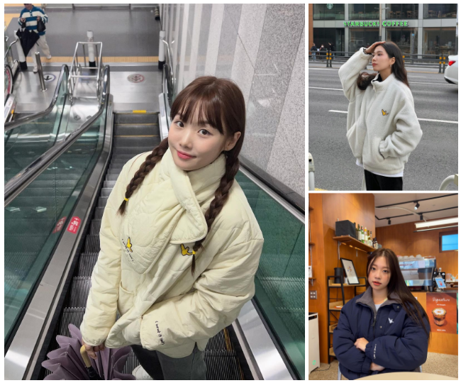 메가 인플루언서들의 와릿이즌 스타일링. 이들이 착용한 '엔젤 리버시블 플러피 집업'은 가벼운 경량 재질에 퀄팅 패턴이 적용된 디자인이 특징으로 보아면/화섬면 두 버전으로 활용할 수 있는 후리스 아이템인데요.