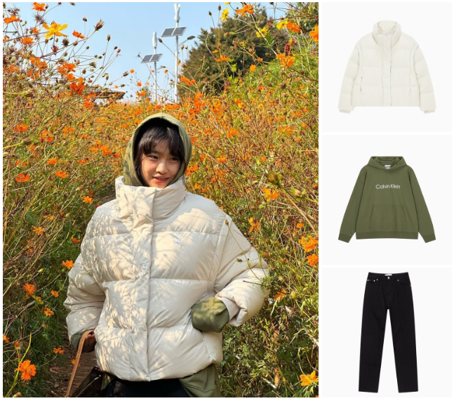 SNS 속, 정호연은 얼굴을 화사하게 밝혀주는 아이보리 컬러의 푸퍼 재킷과 브랜드 로고가 가미된 후드티로 꾸안꾸룩의 정석 패션을 선보였습니다. 아우터로 착용한 숏패딩은 크롭 기장의 경쾌한 스타일이 특징으로 지퍼로 소매 탈부착이 가능한 2-in-1 제품인데요.