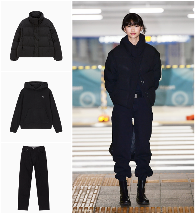 평소 올블랙룩을 선호한다면 주목! 정호연이 공항에서 착용한 아우터 역시 앞서 보았던 숏패딩과 동일한 제품으로, 브랜드 로고가 작게 더해진 후드티, 그리고 블랙 컬러의 데님 팬츠를 함께 매치해 군더더기 없이 심플한 룩을 완성했는데요.