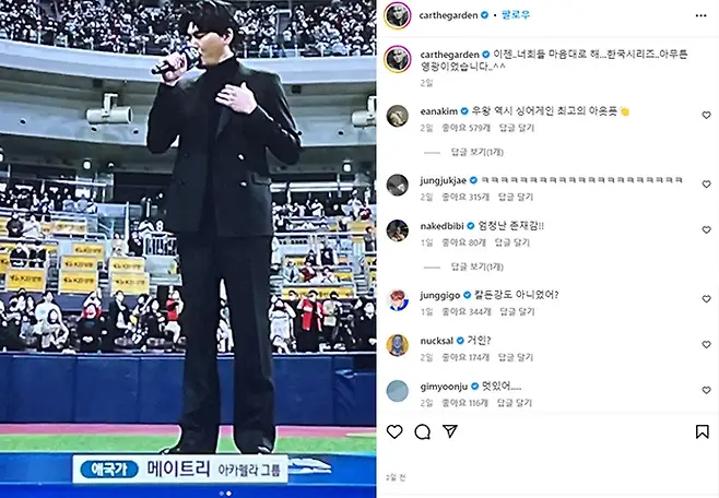 그러면서 “이젠 너희들 마음대로 해. 한국시리즈 아무튼 영광이었습니다.^^”라는 글을 적어 눈길을 끌었으며 댓글에는 웃음과 응원이 줄을 이었다.