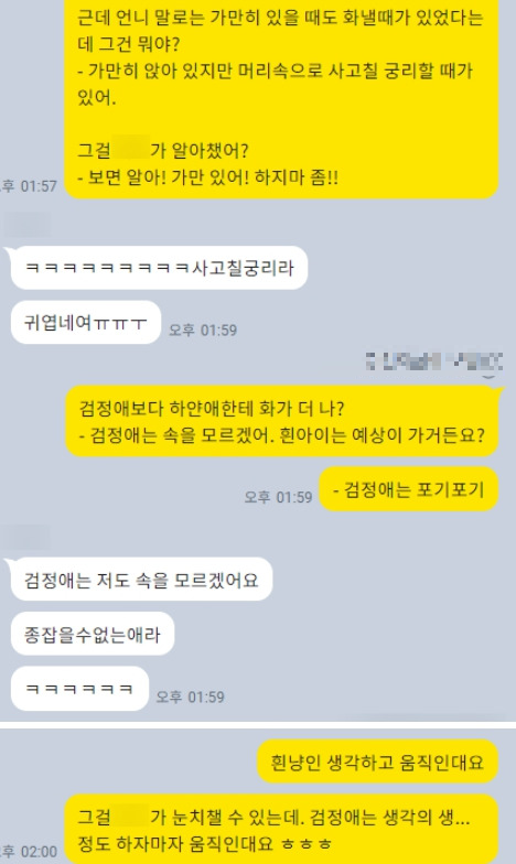 - 흰 고양이 : 생각하고 움직여서 예측할 수 있어, 하지 말라고 화낼 수 있다.