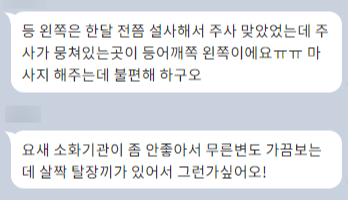특히 왼쪽 등 뒤쪽으로 뻐근함이 있었는데요. 알고 보니 주사로 생긴 멍울이라고 합니다.