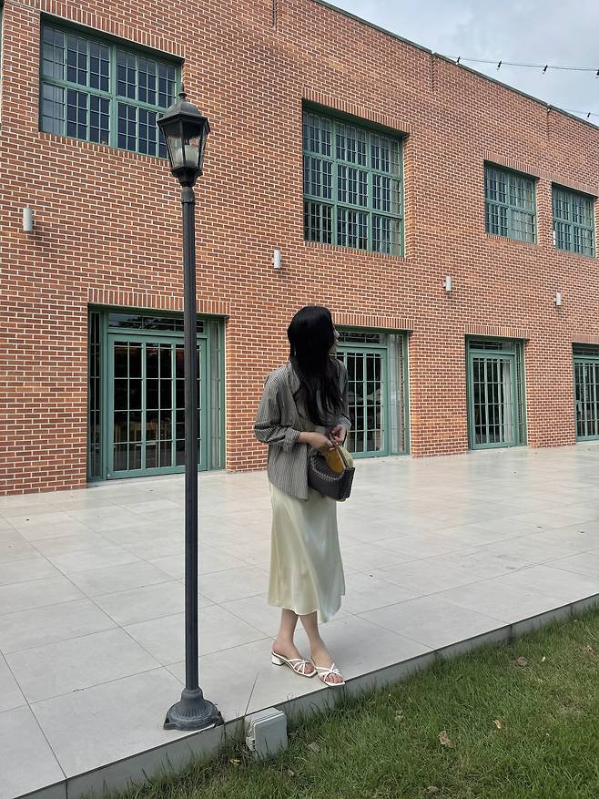 저는 새틴 소재의 슬립 원피스 위에 레이어드해 페미닌한 무드로 스타일링했어요.