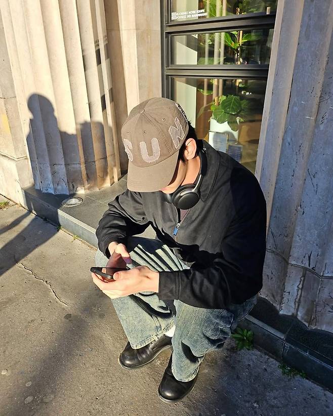 첫 번째 사진은 건물 계단에 쪼그려 앉아 핸드폰을 들여다보는 모습이다. 카키색 모자에는 큼지막한 알파벳이 박혀 있고, 헤드폰이 목에 걸려 있다. 자칫 무심해 보일 수 있는 이 룩은 오히려 ‘꾸안꾸’의 정석처럼 느껴진다. 블랙 재킷과 데님, 첼시 부츠의 조합은 클래식하면서도 젊다. 햇살이 그림자를 길게 늘일수록, 그의 실루엣은 더욱 선명해진다.
