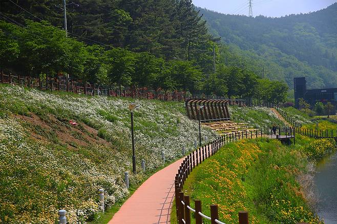 특히, 샤스타데이지와 금계국이 피어 있는 길을 따라 산책을 하다 보면 곳곳에 체육시설이 설치되어 있어 가벼운 운동을 즐길 수도 있다.