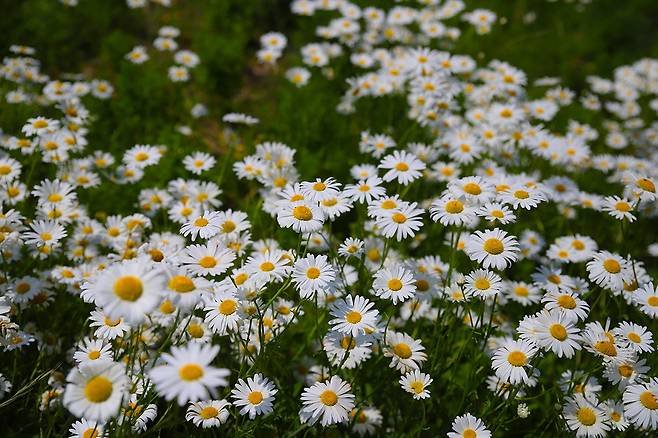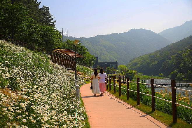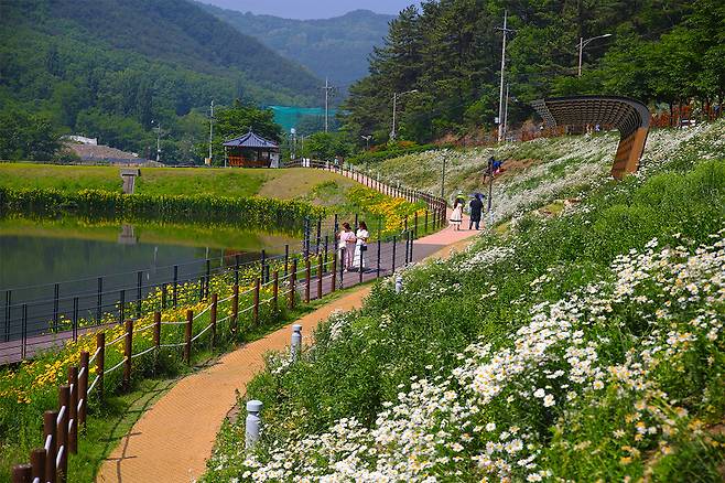 대덕지 주변으로 펼쳐진 순백의 샤스타데이지 군락지와 노란빛으로 반짝이는 금계국이 어우러져, 한적한 산책길을 따라 걷다 보면 마치 동화 속 한 장면에 들어온 듯한 기분이 든다.