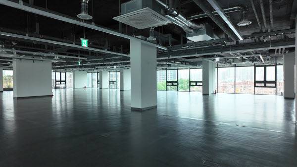 지난 6월 중순 직접 현장을 찾은 결과, 1층부터 텅 빈 상가가 즐비했다. 상업시설은 물론 업무공간 모두 입주가 거의 이뤄지지 않은 상태였다. 2층과 3층은 단 한 곳의 식당만 영업 중이었고, 4층과 5층은 아예 불이 꺼진 채 비어 있었다. 업무시설인 7층 이상도 경기신용보증재단 외엔 임차가 전무했다. 10개 층에 달하는 업무공간 대부분이 공실이다.