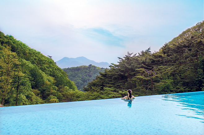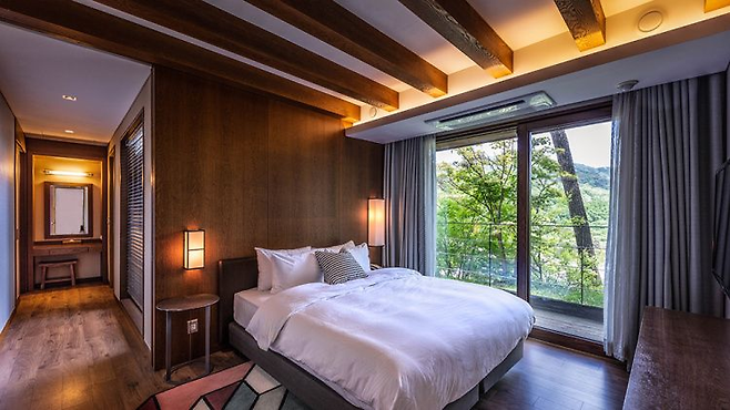 객실 내부는 우드톤 인테리어로 따뜻함이 묻어나고, 객실 밖으로 펼쳐진 마운틴뷰가 일상의 스트레스를 날려줘요. 테라스에 앉아 가만히 숲을 바라보고 있으면, 온몸이 자연 속에 깊이 녹아드는 기분이 들어요.