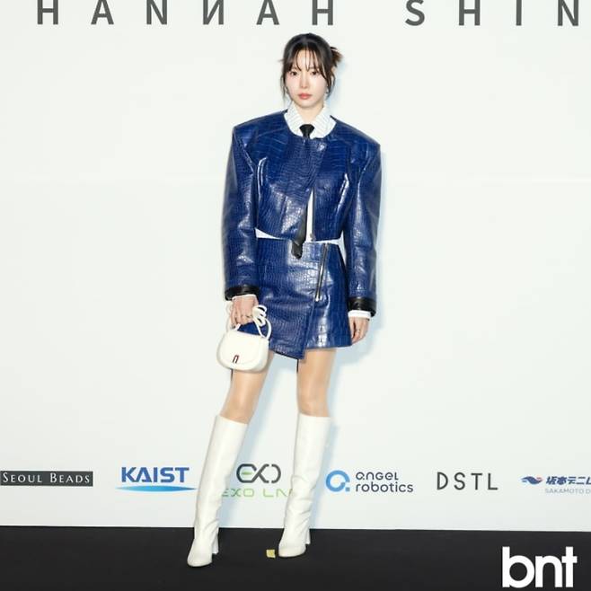 포멀한 행사장에서는 네이비 컬러의 크로커다일 패턴 레더 원피스로 강렬한 인상을 연출하고 있다. 화이트 셔츠를 이너로 매치하여 클래식함을 더했으며, 벨트로 허리 라인을 강조해 여성스러운 실루엣을 완성했다. 화이트 니하이 부츠와 미니 핸드백으로 모던하고 세련된 룩을 완성하고 있다.