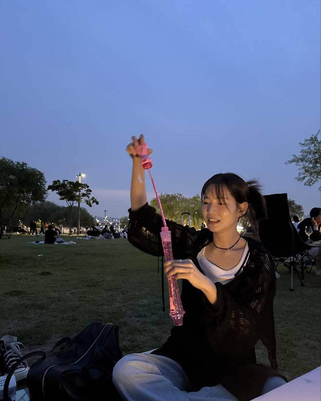 석양이 지는 공원에서는 블랙 가디건과 화이트 탱크톱의 심플한 조합으로 우아한 분위기를 연출하고 있다. 핑크색 물병을 소품으로 활용해 귀여운 포인트를 더했으며, 자연스럽게 흘러내린 헤어스타일로 편안하면서도 여성스러운 매력을 발산하고 있다.
