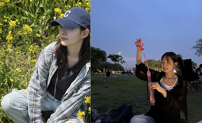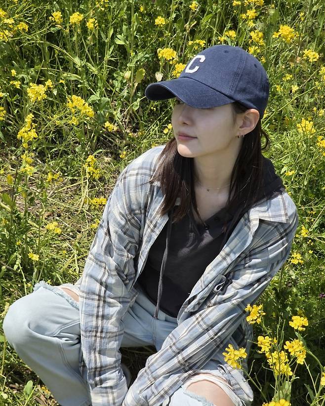 노란 들꽃이 피어있는 자연 속에서는 편안하고 자연스러운 무드를 연출하고 있다. 그레이 체크 셔츠를 오버사이즈로 걸쳐 입고 블랙 이너를 매치한 레이어드 스타일링으로 캐주얼한 매력을 보여주고 있으며, 'C' 로고가 새겨진 네이비 캡으로 스포티한 포인트를 더하고 있다.