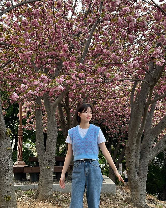 하승리는 분홍빛 벚꽃이 만개한 공원에서 캐주얼하면서도 세련된 스타일링을 연출하고 있다. 파란색과 보라색이 조화롭게 믹스된 타이다이 베스트를 화이트 티셔츠 위에 레이어드하여 트렌디한 무드를 자아내고 있으며, 하이웨스트 데님 팬츠로 다리 라인을 길어 보이게 하는 스타일링 센스를 보여주고 있다.