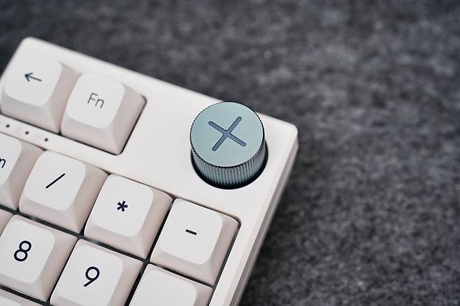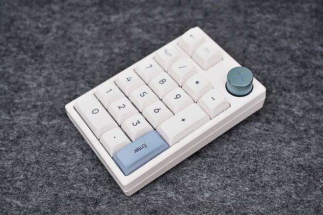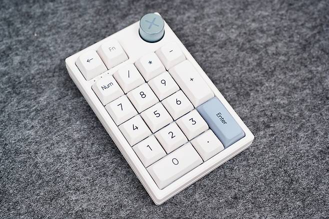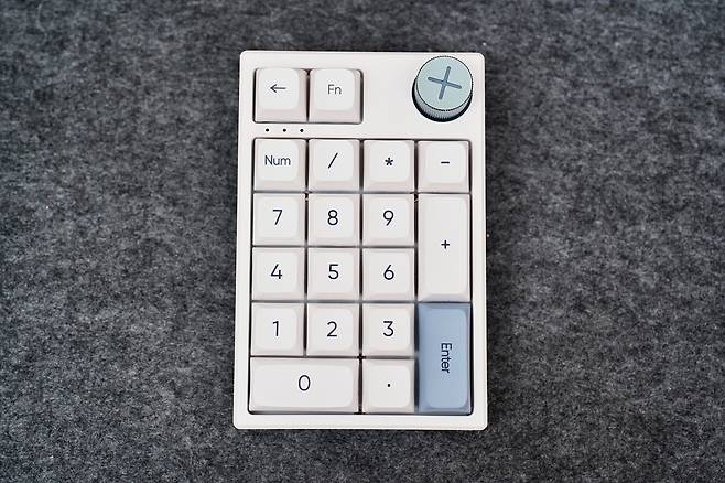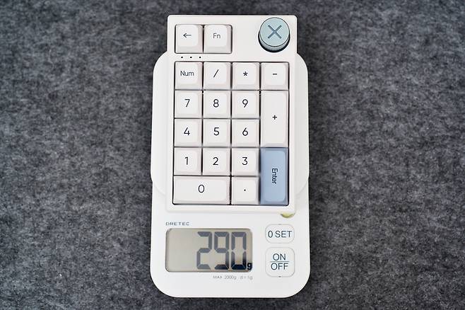 전체적인 키 배열은 19키 구성이며, 일반적인 넘버패드에서 백스페이스, Fn 키, 볼륨다이얼이 추가 된 키패드입니다. 무게는 209g으로 너무 가볍지도 무겁지도 않은 무게였습니다.