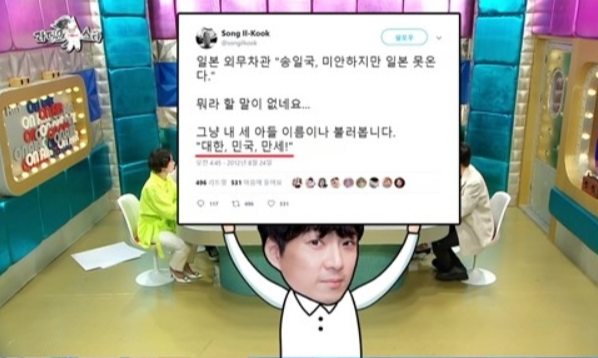 이에 송일국은 "내 세 아들 이름이나 불러본다. 대한, 민국, 만세"라는 짧지만 의미심장한 글로 소신을 드러냈다.