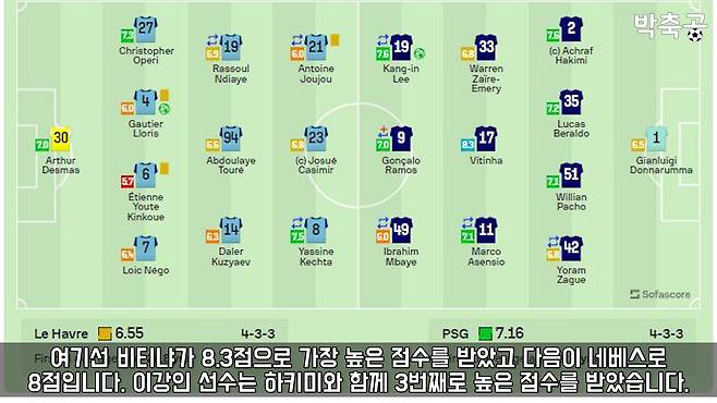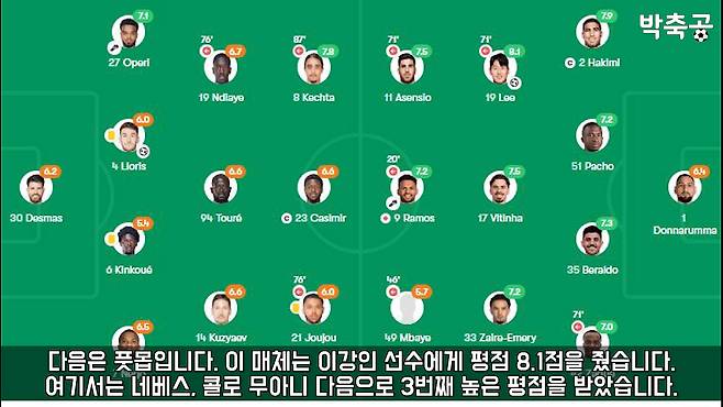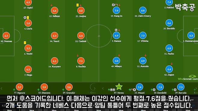 소파스코어: 이곳에서는 이강인 선수에게 평점 7.6점을 주었으며, 비티냐가 8.3점으로 가장 높은 점수를 받았고 이강인은 하키미와 함께 3번째로 높은 점수를 받았습니다.
