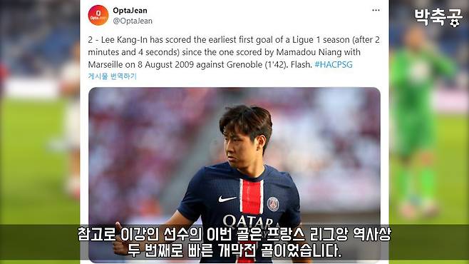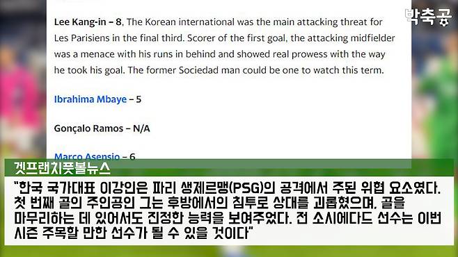 겟프렌치풋볼뉴스: 이 매체는 이강인 선수에게 평점 8점을 주며 선발 선수들 중 최고 평점을 부여했습니다. 특히 이 매체는 이강인이 PSG의 공격에서 주요 위협 요소였으며, 그의 침투와 골 마무리 능력이 돋보였다고 평가했습니다.