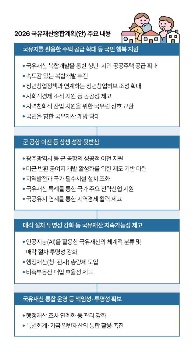 정부가 도심 노후 공공청사, 유휴 부지 등 국유재산을 활용해 공공주택 1만 5000호를 추가 공급합니다. 기존 2035년까지 계획된 2만 호와 합해 3만 5000호 이상을 공급할 계획입니다. 또 인공지능(AI)과 같은 첨단산업에 국유재산을 활용할 경우 사용료를 2.5%에서 1%로 대폭 인하합니다. 그간 재정의 보완적 역할에 그쳤던 국유재산을 국민의 공동자산으로 재인식하고 정책기조를 전환하겠다는 취지입니다. 자세한 내용은 정책주간지 'K-공감'을 확인하세요.