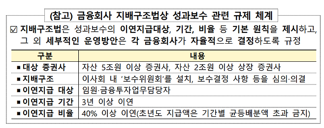 성과보수 이연지급 대상을 임의로 적용한 경우도 있었다. 성과보수는 개별 임직원별로 이연 지급돼야 하는데, 부동산PF 담당 각 본부 단위로만 구분한 것이다. 이런 위법한 규정에 따라 지급된 성과급만 95억 원에 달한다. 금감원은 이번에 확인된 위규 사항에 대해 엄중하게 책임을 묻겠다는 방침이다.
