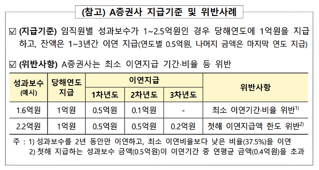 금감원은 이번 조사에서 PF 직원들에게 성과보수를 이연하지 않고 일시 지급한 증권사를 적발했다. 한 증권사는 상당수 직원에게 성과보수 13억원씩을 한꺼번에 지급했다. 다른 증권사는 계약직 부동산 PF 담당 직원들에게 성과보수 20억원씩을 전액 일시에 지급했다. 또 다른 증권사는 자의적 판단으로 성과보수 3억원을 일시 지급했다.