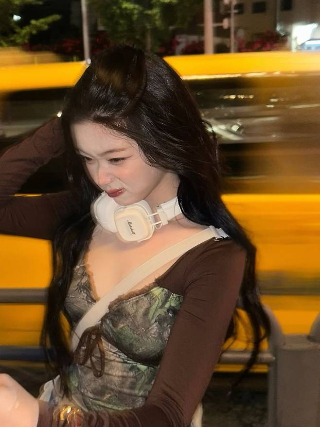 이번 착장의 핵심은 섹시함과 스포티함을 동시에 담은 믹스매치다. 이너로 착용한 슬리브리스 탑은 깊은 브이넥 라인과 얇은 끈 디테일로 글램한 무드를 강조했고, 위에 걸친 초슬림핏 브라운 톱은 체형을 드러내면서도 안정감을 더했다. 여기에 어깨에 자연스럽게 멘 크로스백과 목에 두른 화이트 헤드폰이 Y2K 분위기를 더하며 스타일에 포인트를 줬다.
