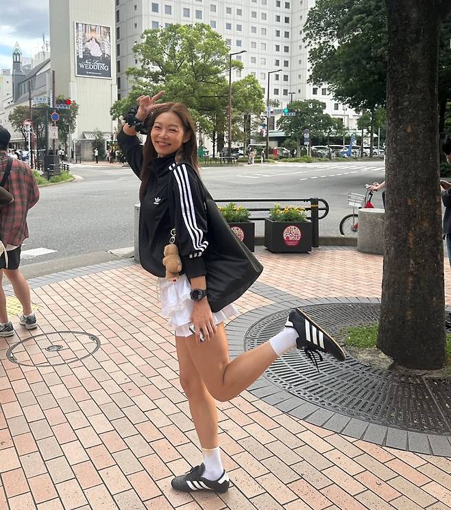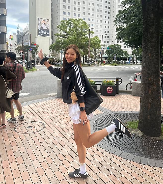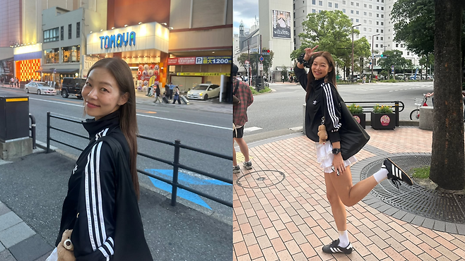그녀는 아디다스의 클래식한 블랙 트랙탑 재킷에 의외의 아이템을 매치하는 센스를 발휘했죠.