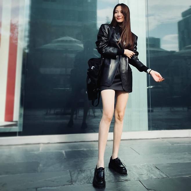 블랙 레더 재킷과 미니스커트로 시크한 올블랙 스타일링을 선보였다. 긴 생머리와 매끈한 실루엣으로 여성스러움을 강조하면서도, 투박한 로퍼로 트렌디한 포인트를 더해 세련된 스트리트 무드를 완성했다.