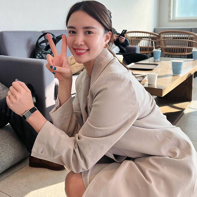 베이지 컬러의 오버사이즈 수트로 부드러운 분위기를 자아내고 있다. 깔끔한 포니테일 헤어스타일과 미니멀한 액세서리로 포인트를 주었으며, 청순하면서도 프로페셔널한 이미지를 연출했다.