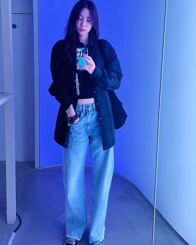 블랙 오버사이즈 셔츠와 하이웨이스트 와이드 데님 팬츠로 편안하면서도 세련된 스트리트 패션을 선보이고 있다. 크롭탑과 레이어드하여 트렌디한 실루엣을 연출했으며, 액세서리로 포인트를 더했다.