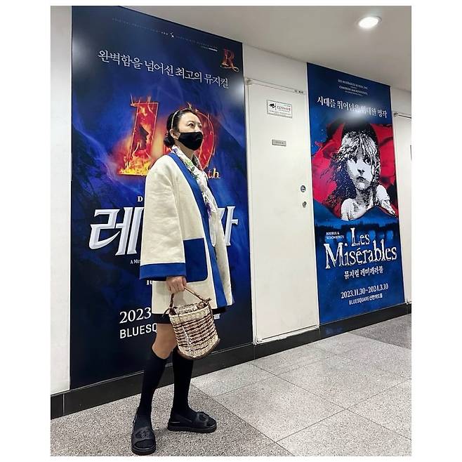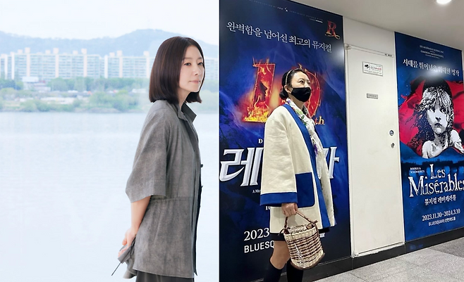 두 번째 사진의 김희애는 화이트와 블루 배색의 두툼한 코트를 중심으로, 블랙 미니 원피스와 니삭스, 로퍼를 매치해 클래식하면서도 위트 있는 스타일을 선보인다. 손에는 라탄 소재의 바스켓 백을 들어 자연스러운 포인트를 더했으며, 목에는 스카프를 둘러 전체적인 룩에 고급스러운 무드를 부여했다. 포멀한 장소에서도 자신만의 감각을 잃지 않는 김희애의 스타일링이 돋보인다.