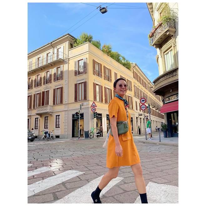 첫 번째 사진에서 김희애는 밝은 오렌지 컬러의 미니 원피스를 선택해 경쾌한 분위기를 연출하고 있다. 여기에 카키색 크로스백과 블랙 앵클삭스, 메리제인 슈즈를 매치해 실용적이면서도 세련된 스타일을 완성했다. 목에는 패턴이 돋보이는 트윌리 스카프를 더해 포인트를 주었으며, 전체적으로 팝한 컬러감과 액세서리의 조화가 돋보인다. 도시적이면서도 자유로운 여행지의 무드를 감각적으로 표현한 룩이다.