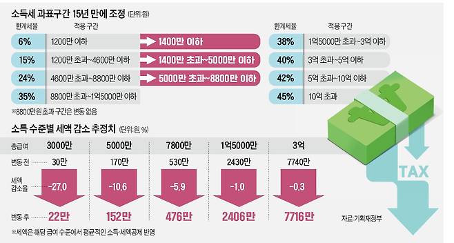 이번 정부의 소득세법 개정안의 핵심은 소득세 과세표준 구간 조정과 근로소득세액공제 한도 축소다. 15년째 고정돼있던 소득세 과세표준 구간 중 8800만원 이하 3개 구간을 바꾸겠다는 것이다. 1200만원 이하는 1400만원 이하로, 1200만원~4600만원 이하는 1400만원~5000만원 이하로, 4600만원~8800만원 이하는 5000만원~8800만원 이하로 각각 바뀐다.
