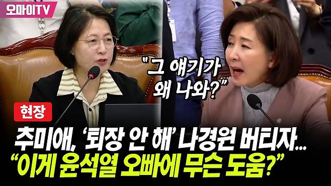 - 추미애(민주당 의원, 법사위원장)가 나경원에게 한 말이다. 나경원은 “윤석열 얘기가 왜 나오냐”고 반발했다.