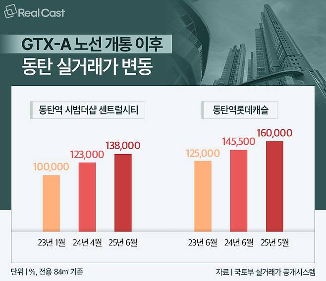 동탄의 랜드마크 단지 '동탄역롯데캐슬' 전용 84㎡ 역시 개통 전인 2023년 6월 12억5,000만원에서 2024년 6월에는 14억5,500만원으로, 2025년 5월에는 16억원까지 오르기도 했습니다. 동탄에서 수서까지 GTX를 이용하면 19분이면 닿을 수 있게 되자, 입주민들 사이에서는 서울 집값도 비싼데 굳이 서울살이를 할 필요가 없다는 얘기도 나옵니다.