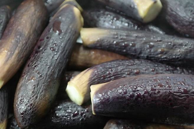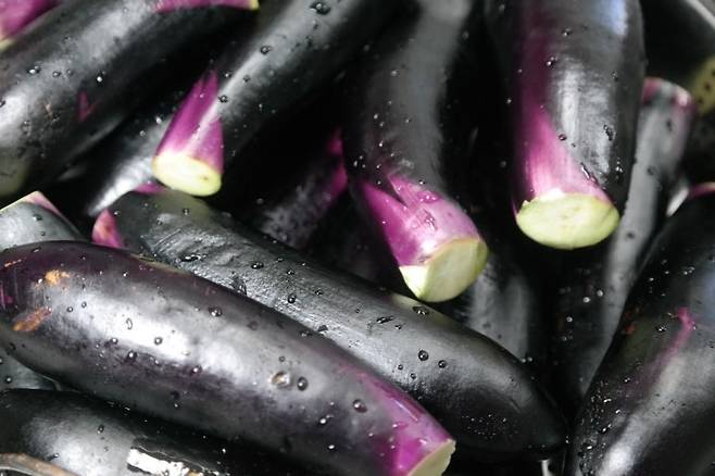 1. 가지 손질: 가지를 다듬을 때 꼭지를 따로 분리하여 깨끗하게 씻습니다.