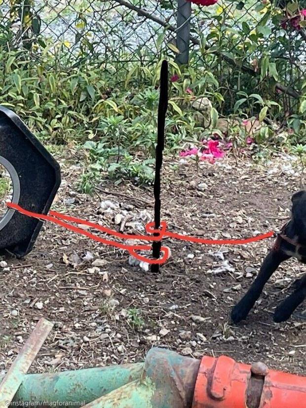 짜장이는 쏟아지는 비에 우왕좌왕했는지, 집과 쇠말뚝에 연결된 쇠줄은 어지럽게 꼬여있는 상태였다.