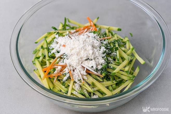 먼저 애호박 1개를 깨끗이 씻어 0.3cm 두께로 곱게 채 썬다. 당근은 아주 소량만 곱게 채 썰고, 청양고추 3개는 송송 썬다. 이 세 가지 재료를 큰 볼에 넣고, 고운 소금 1/4~1/5큰술을 넣어 골고루 섞는다. 소금을 뿌리고 잠시 두면 애호박에서 자연스럽게 수분이 빠져나온다.
