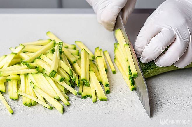 1. 애호박은 깨끗이 씻어 0.3cm 두께로 채 썬다