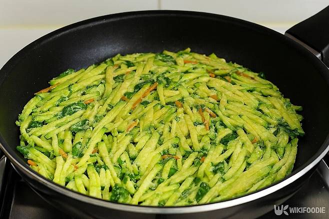 – 물을 넣지 말고 애호박 수분만으로 반죽해야 더 바삭하게 익는다