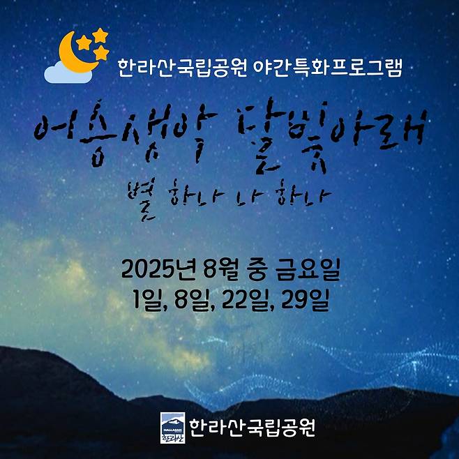 제주도 세계유산본부 한라산국립공원관리소(소장 홍승지)가 8월 야간 특화 탐방 '어승생악 달빛 아래, 별 하나 나 하나'를 처음 선보인다.