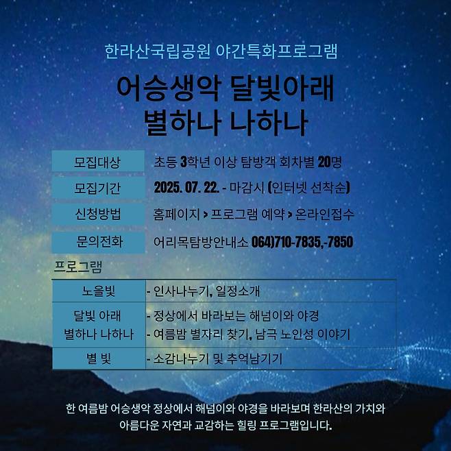 참가 신청은 한라산국립공원 누리집 '프로그램 예약' 메뉴에서 7월 22일부터 회차별 20명씩 선착순으로 접수한다.